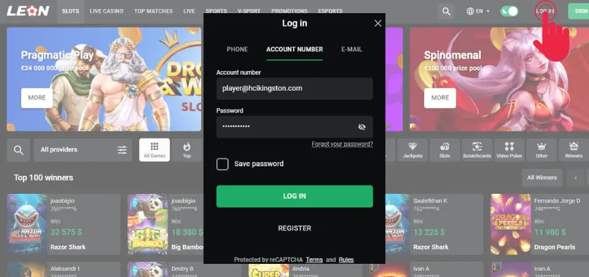 Após o registro bem -sucedido, para jogar o jogo Leon Aviator, clique no botão de login. A autorização pode ser feita usando seu número de telefone, email ou número da conta.