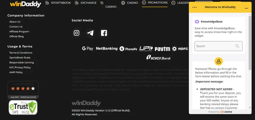 O Windaddy Casino Aviator oferece várias opções para entrar em contato com o suporte ao cliente, como email ([email protected]) ou utilizando o formulário da web. Normalmente, você pode esperar uma resposta da equipe de suporte de email dentro de um curto período de tempo. Além disso, o recurso de bate -papo de texto está disponível 24/7 para os usuários entrarem em contato com a equipe de suporte do cassino. Durante o nosso processo de revisão, a equipe de atendimento ao cliente foi rápida e forneceu respostas úteis.